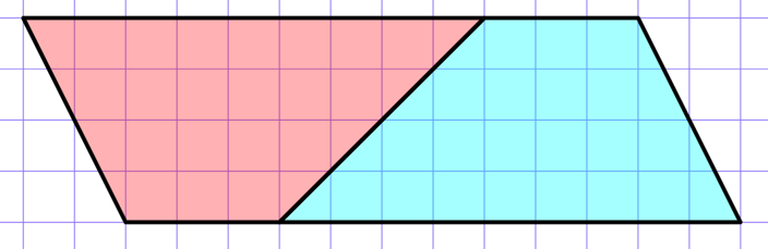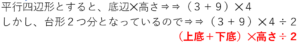 台形の公式を求めるのに、子どもたちにわかりやすい指導法は、次のように、具体的な台形について同じものを2枚逆転して重ねて提示するやり方です。